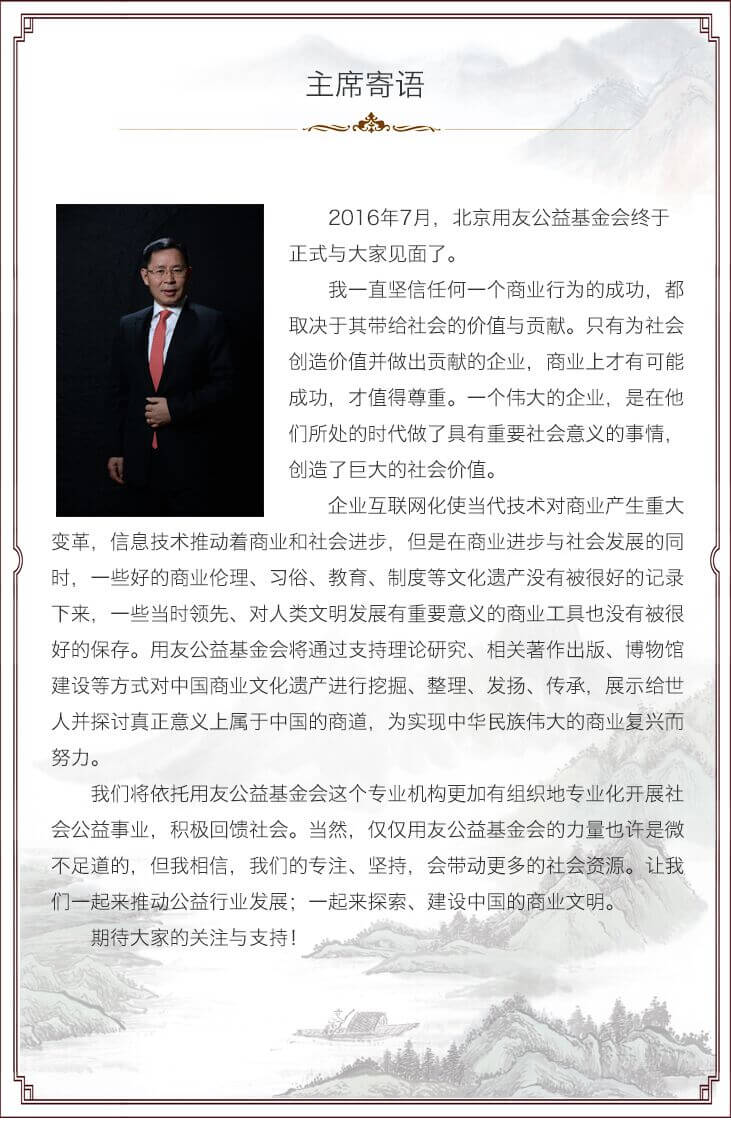 北京用友公益基金会由用友网络科技股份有限公司捐赠1000万元发起成立,是国内首家致力于中国商业文化遗产整理与保护的非公募基金会。基金会以中国商业文化遗产整理与保护为核心项目,将通过支持理论研究、学科建设、数据库建设、专业博物馆及数字博物馆建设等方式对中国商业文化遗产进行挖掘、整理、出版、展示;同时关注重大灾害、推动公益行业发展及其他公益项目。